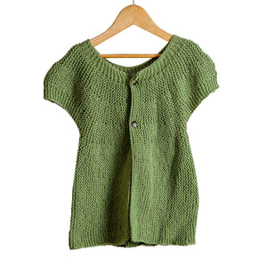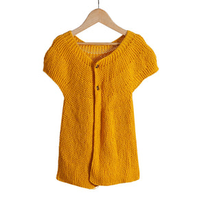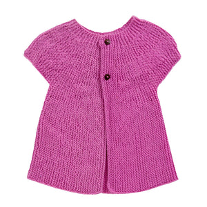 - Classic rose-themed baby frock hand-knitted from 100% organic wool.