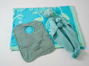 - Gift set includes a soft cuddly teddy bear, organic cotton blanket, and muslin bib.