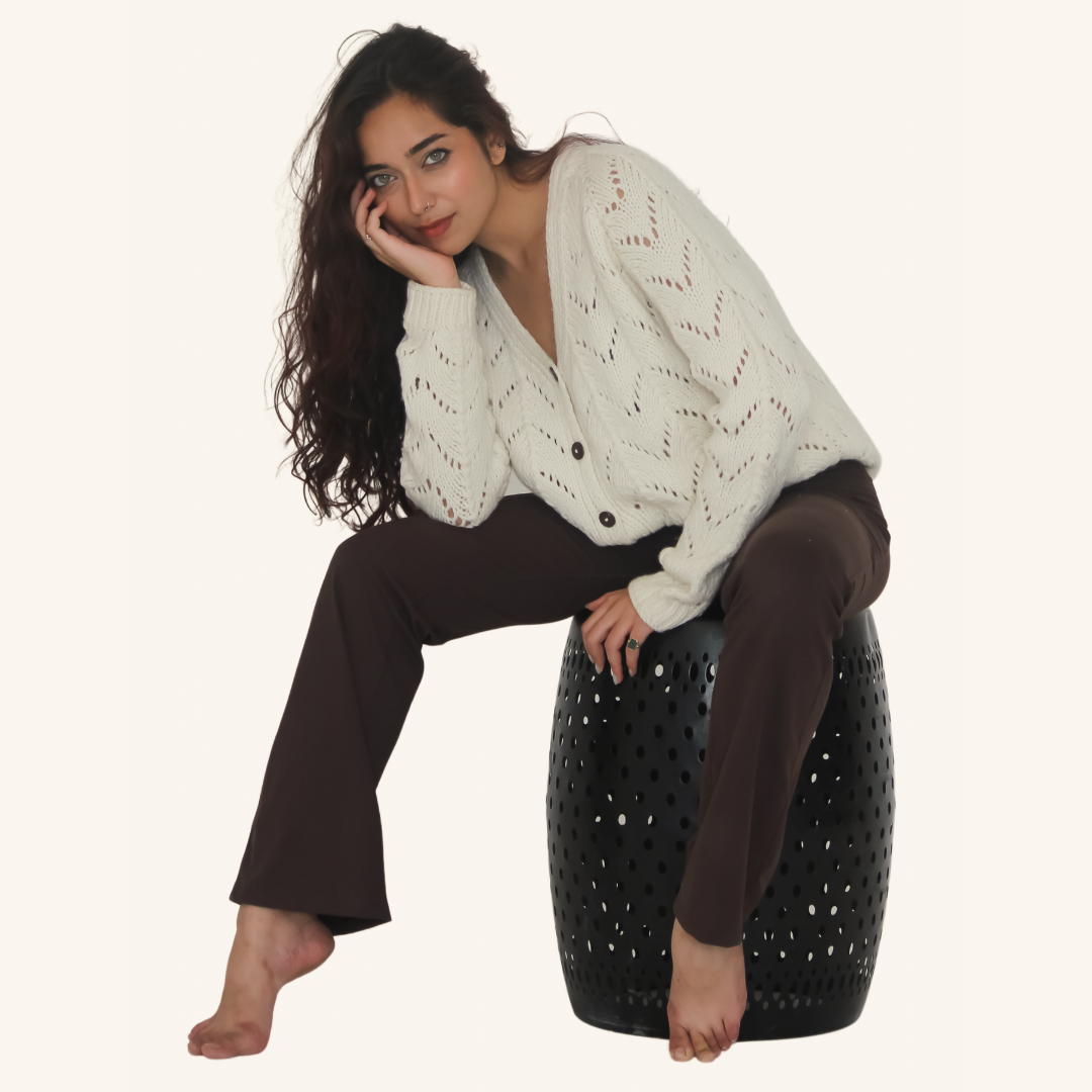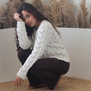 The Kaze Cardigan symbolizes gentle breezes and effortless style. Handknitted with authentic wool, this minimalist piece is perfect for modern women.