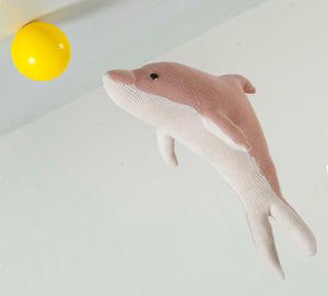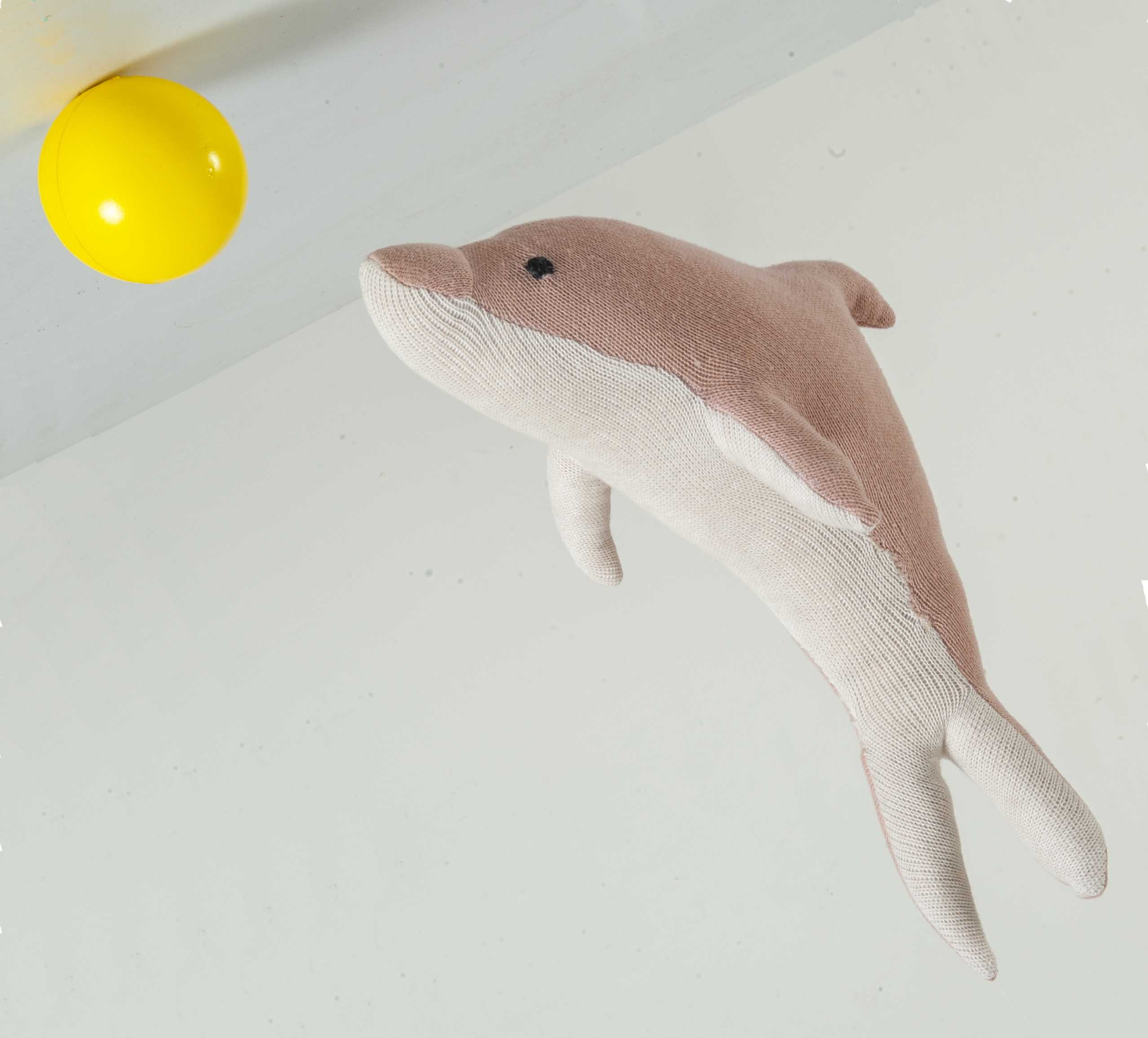 - Dolphin toy in white and pink, hand-knitted from 100% premium cotton.