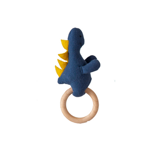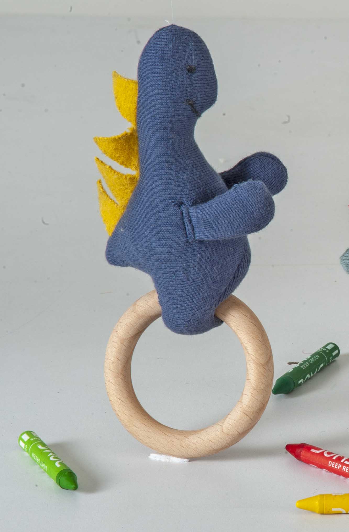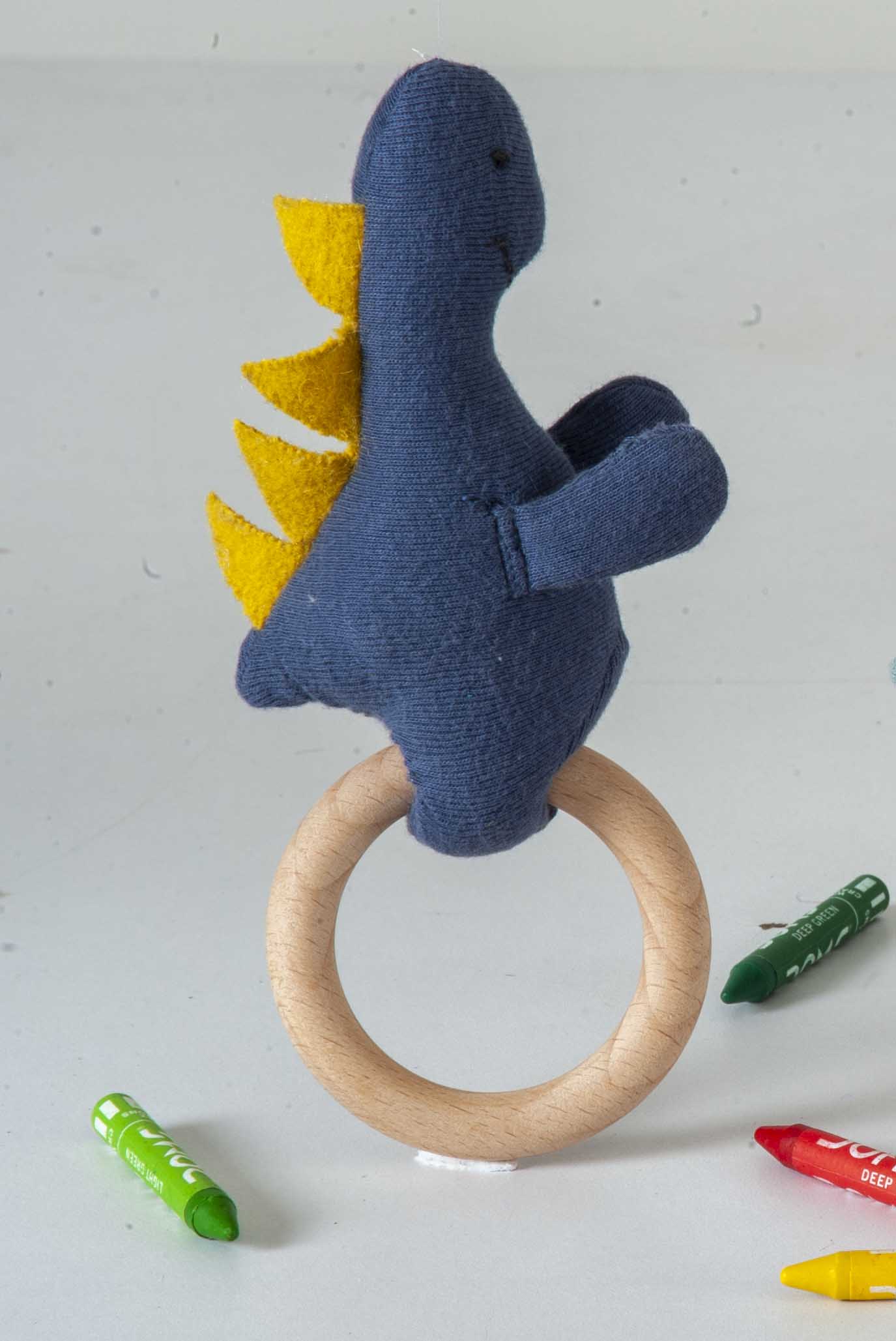 - Dark blue and yellow dino rattle, hand-knitted from 100% premium cotton.