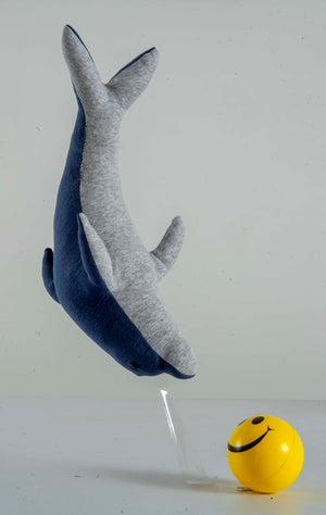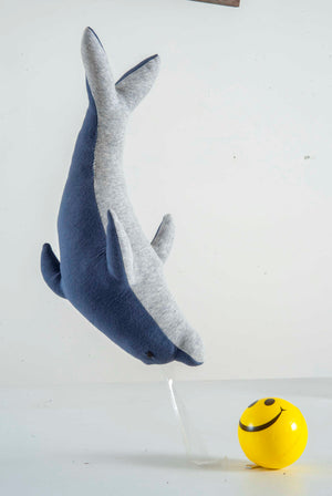 - Dolphin toy in white and dark blue, hand-knitted from 100% premium cotton.