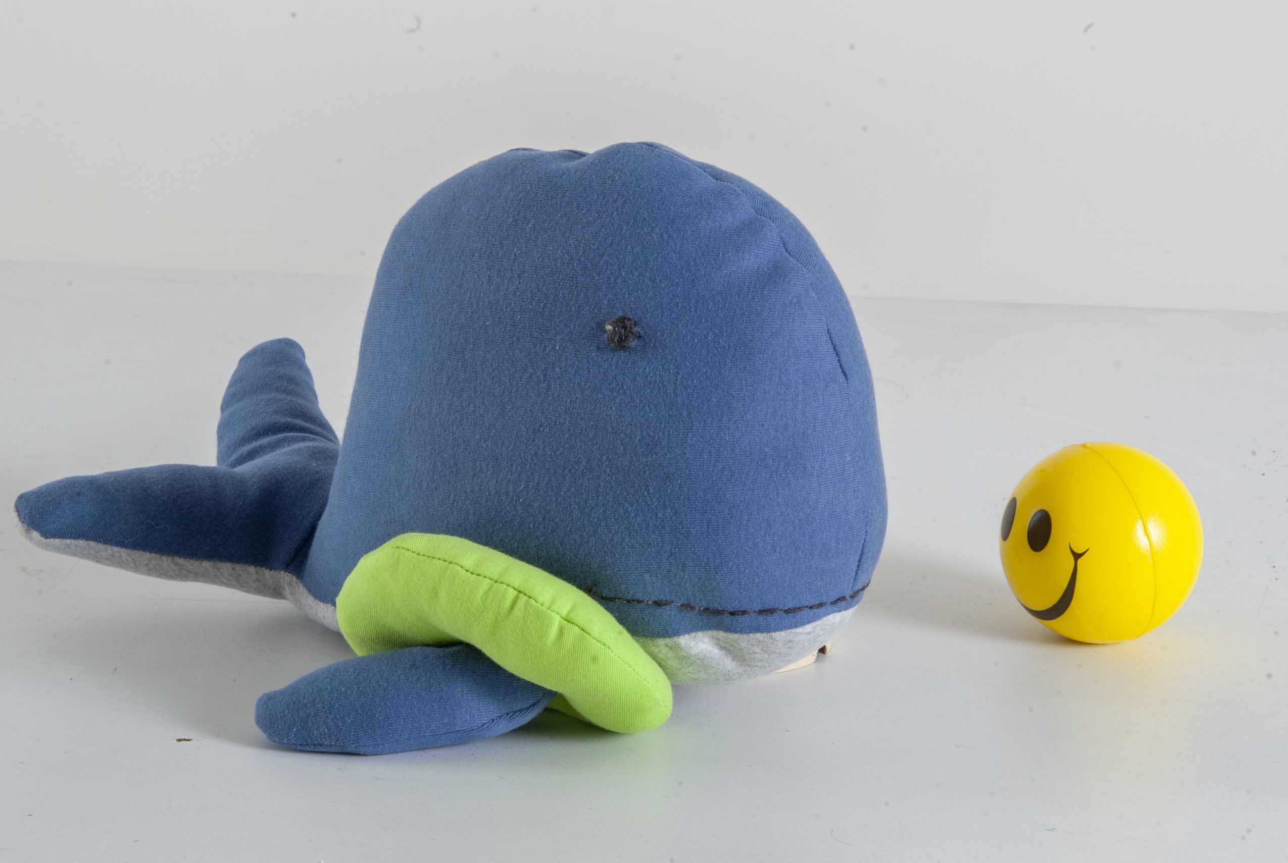 - Whale toy in blue, light green, and grey, hand-knitted from 100% premium cotton.