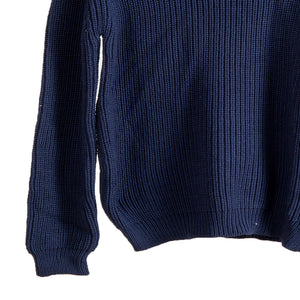 Elevate your style with sustainable and skin-friendly organic wool pullover in deep mid-night blue.